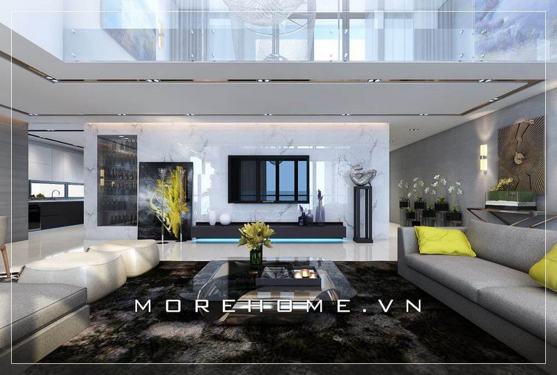 Trang trí phòng khách chung cư cao cấp, sử dụng đá ốp tường màu màu trắng vân mây sang trọng tạo điểm nhấn nổi bật cho căn phòng