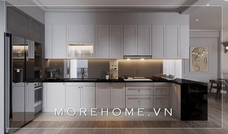 Thiết kế nội thất phòng bếp hiện đại sử dụng tone màu trắng chủ đạo tạo nên không gian tinh tế và tiện nghi