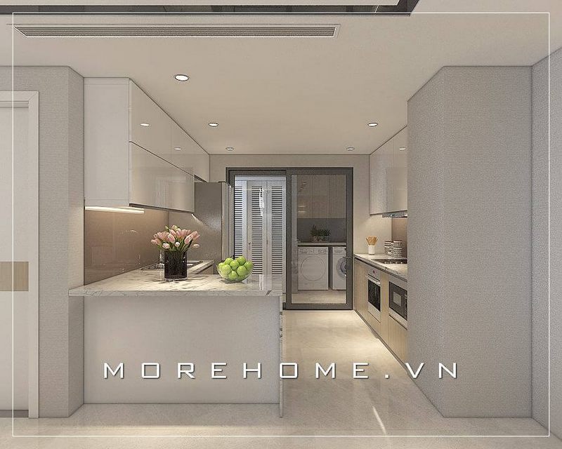Thiết kế phòng bếp chung cư hiện đại, với nội thất tone màu trắng đơn giản và tiện nghi cho người nội trợ