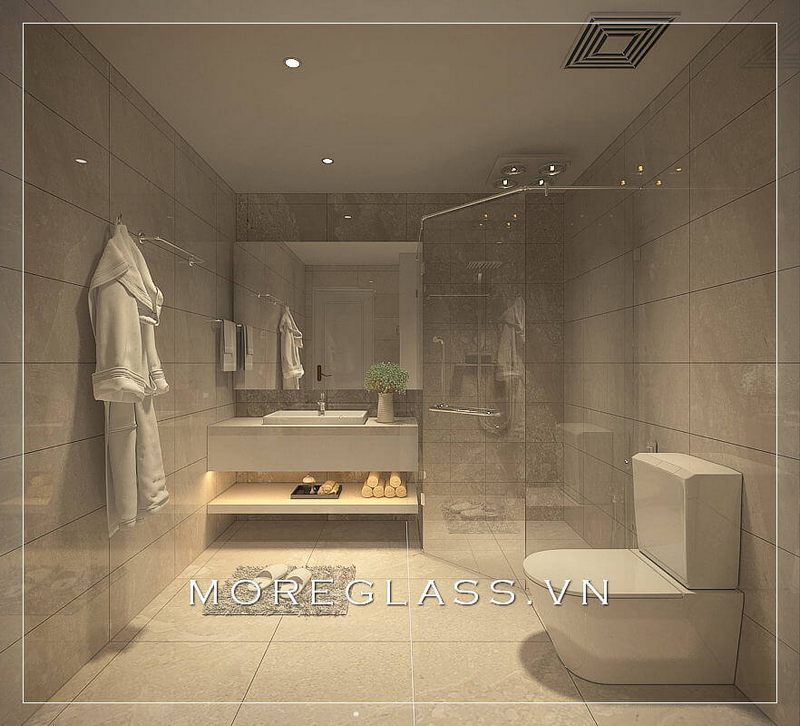 Vách tắm kính 90 độ ngăn giữa không gian phòng tắm đứng tránh văng nước gây ảnh hưởng tới các không gian khác trong phòng
