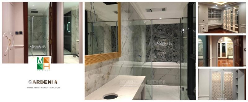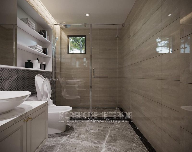 Vách tắm kính 180 độ hiện đại nhà phố, biệt thự giúp phân chia 2 khu vực phòng tắm và phòng ngủ đem lại sự thông thoáng tối ưu được diện tích.