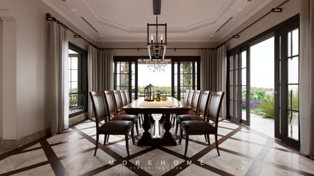 Phòng ăn với phong cách địa trung hải nội thất thiết kế màu sắc và chất liệu hài hòa mang tới một không gian tiện nghi và ấn tượng cao về tính thẩm mỹ