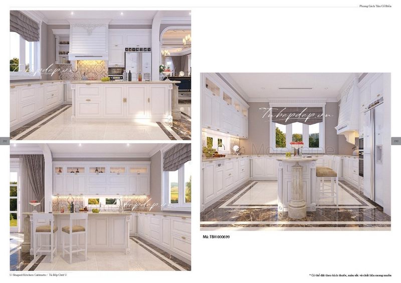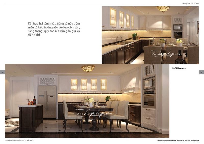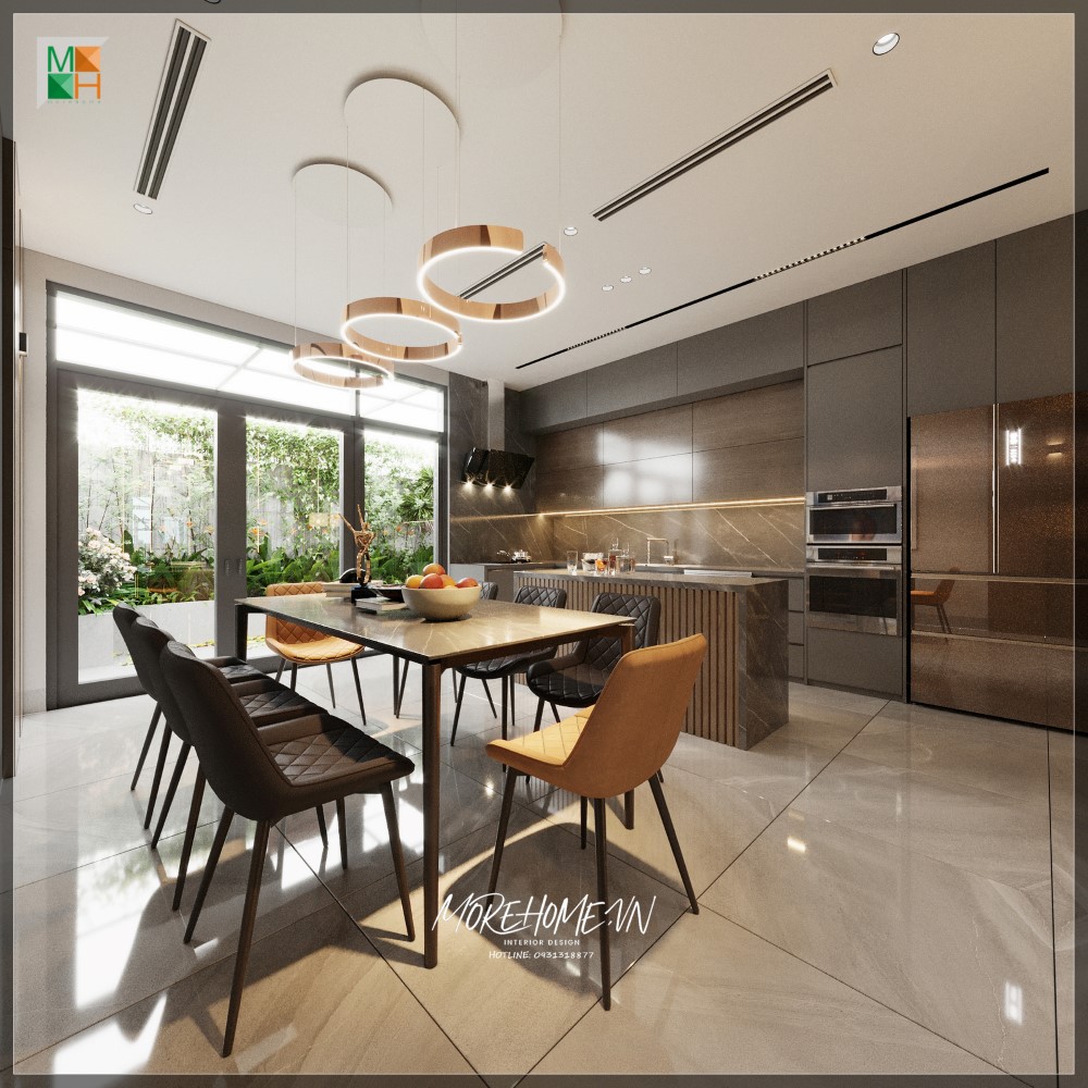 Thiết kế phòng ăn liền phòng bếp tạo sự gần gũi gắn kết giữa các không gian và cũng giúp tiết kiệm diện tích đáng kể, phù hợp cho biệt thự, nhà phố, chung cư cao cấp phong cách tân cổ điển.